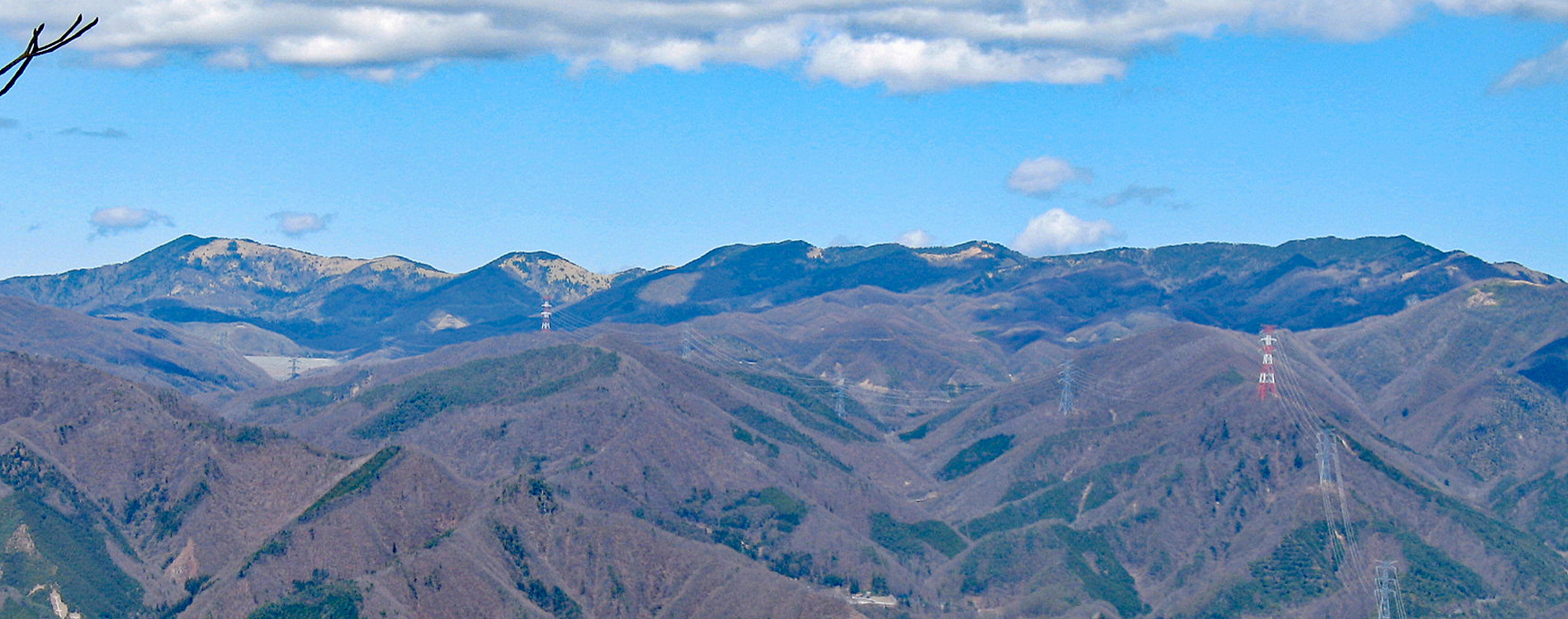 - 4月04日 〃、大菩薩嶺(左端)小金沢山(中央)、牛奥雁ヶ腹摺山(中央右)、黒岳(右端)